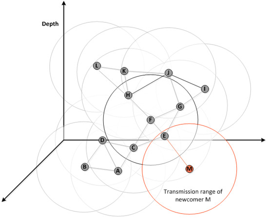 At the deployment time, the start time of the initial phase for each node is set. During the initial process, every node randomly broadcasts its beacon packet to its neighbourhood. The beacon packet includes the ID and depth of the sender. Each node exploits a pressure gauge, which is embedded inside the sensor, to obtain its depth [48]. The pressure gauge may give some variance in the depth reading; however, considering such an error in depth reading is out of scope of this work.
