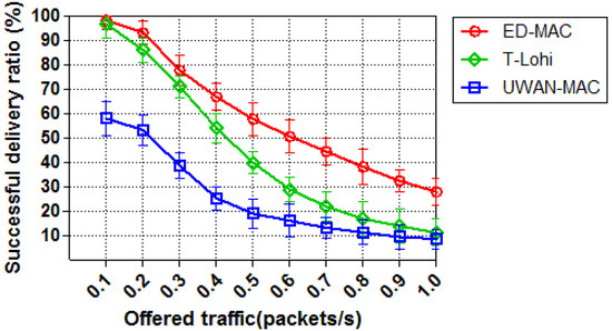 In the first set of simulations, we compare the successful delivery ratio of all three protocols by varying offered traffic while the number of node equals to 10. Figure 11 shows the successful delivery ratio of each protocol as a function of offered traffic. The successful delivery ratio of ED-MAC outperforms that of other two MAC protocols, T-Lohi and UWAN-MAC. This is because ED-MAC has the ability to address the hidden node and the spatio-temporal uncertainty problems which cannot be detected by UWAN-MAC protocol resulting in more packet loss and collisions. At a low traffic load, the successful delivery ratio of ED-MAC and T-Lohi almost achieves 100%, while UWAN-MAC only reaches 60%. This is due to the inefficient scheduling of UWAN-MAC, which causes considerably more collisions and retransmissions, where ED-MAC and T-Lohi exploit space-time uncertainty and high latency to avoid collisions and retransmissions. When the traffic is further increased, however, T-Lohi shows a fast degradation of the successful delivery ratio due to an increasing number of collisions of tone packets. The performance of ED-MAC in this simulation is far better than that of T-Lohi and UWAN-MAC, as ED-MAC employs a priority approach based on the depth of each sensor node to schedule the transmission and also to avoid data collisions. ED-MAC also allows more communications in one slot, by using temporal and spatial reuse, which significantly increases the acoustic channel utilisation for underwater networks.
