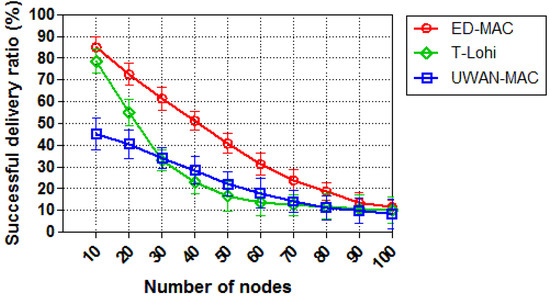We then study the network scalability of each protocol by increasing the sensor nodes and keeping the offered traffic constant (with 0.25 packets/s). As can be seen from Figure 12, the successful delivery ratio of all three protocols is inversely proportional to the number of nodes. With 10 nodes, ED-MAC reaches 88% compared to 78% and 45% for T-Lohi and UWAN-MAC, respectively. This is due to the specific benefits of ED-MAC, such as high scalable scheduling; consequently, it can handle more packets than either T-Lohi or UWAN-MAC. When the number of nodes is increased, T-Lohi’s successful delivery ratio rapidly reduces due to an increasing number of collisions of tone packets, thus resulting in incorrect reservations. The impact of increasing the number of nodes on the successful delivery ratio in T-Lohi is more profound. Still more interesting, however, is that UWAN-MAC only achieved 45% of the successful delivery ratio (within 10 nodes), which is much lower than the successful delivery ratio of either ED-MAC or T-Lohi. This is because UWAN-MAC is designed to only use one control packet across the network.