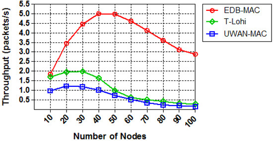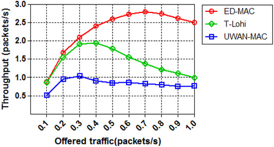 We next compare the throughput of those protocols by increasing the node density while the offered traffic is kept fixed to 0.25 packets per second. Figure 14 shows the throughput of the three protocols as a proportional to the number of nodes. As the number of nodes increases, the network throughput increases correspondingly and eventually reaches a saturation point. ED-MAC reaches higher network throughput and performs better than other two MAC protocols in the same circumstances. This is due to its specific benefits from a high scalable scheduling to handle more data packets than T-Lohi and UWAN-MAC. Moreover, the curve of ED-MAC exhibits significantly increased by achieving five packets per second within 50 nodes, and then a slower decline compared with that of T-Lohi and UWAN-MAC, which proves the effectiveness of the proposed protocol. Thus, the scalability of handling more packets in ED-MAC outperforms that in T-Lohi and UWAN-MAC.