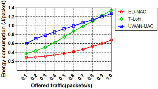 We also investigate the effect of increasing the node density in each protocol in terms of energy consumption while the offered traffic is constant. As shown in Figure 16, the energy consumption of the three protocols is drawn as a function of the number of nodes. As the number of nodes increases, the energy consumption increases correspondingly. This is because, when the number of nodes increases, more nodes are involved; therefore, there is more intensive competition to access the channel. ED-MAC consumes the lowest energy among the two other protocols because it adopts energy conservation measures by considering hidden terminal and spatial-temporal uncertainty problems. As the node density increases, T-Lohi consumes significantly more energy per packet due to an increasing number of collisions. Specifically, ED-MAC consumes on average only 61.5% of the energy consumption of UWAN-MAC and 63.8% of the energy consumption of T-Lohi. T-Lohi consumes the highest energy among other protocols, although it conserves energy by employing a wake-up tone receiver that allows very low-power listening for wake-up tones.
