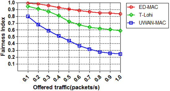 In the last set of simulations, we study the effect of increasing the offered traffic on the fairness index among those three protocols. Figure 17 shows the result of an experimental setup consisting of ten sensor nodes that are run for an hour to strenuously test the fairness of the three protocols. First, it is observed that the ED-MAC protocol exhibits a high fairness index of almost 98%, which then slightly decreases over all the traffic loads. In comparison, the fairness index of T-Lohi and UWAN-MAC (within 0.1 offered traffic) achieves nearly 94% and 80%, respectively. When the offered traffic further increases, the fairness index of the latter protocols significantly decreases. This is mainly because of an extensive competition between nodes to access the channel. ED-MAC protocol achieves higher fairness of transmission and throughput than other protocols due to the channel reservation, which is based on the depth criteria.
