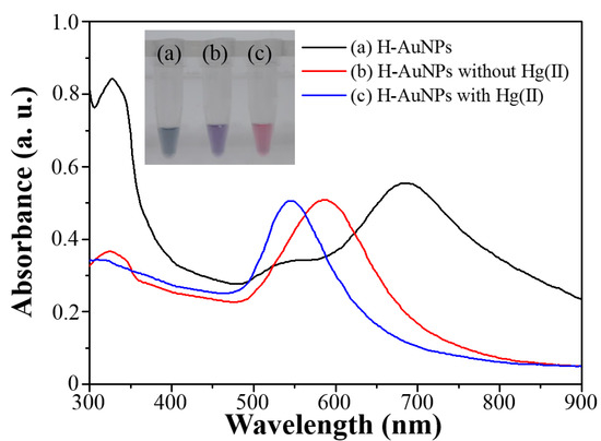 UV-Vis spectra of (a) the H-AuNS probe prior to the reactions and the H-AuNS probe, (b) without and (c) with Hg(II) (1.0 μM) in the presence of the HCl/Au(III)/H2O2 solution. Inset: color visualization for (a), (b) and (c).