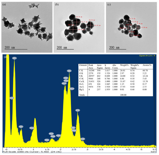 Figure 2 represents the TEM images and EDX spectrum of the corresponding Au nanomaterials. Prior to the reaction, the H-AgNSs typically had 4–8 branches, with an average tip-to-tip distance of 42.5 ± 0.7 nm from TEM measurements (Figure 2a). In the absence of Hg(II), Au(III) adsorbed on the H-AuNS surface and reduced to form irregular AuNPs with a diameter of 88.8 ± 6.5 nm (Figure 2b). However, when Hg(II) was present, the AuNPs produced were smaller than those without Hg(II) (Figure 2c), and they possessed more spherical morphology with an average diameter of 48.2 ± 4.0 nm. These observations reveal that Hg(II) caused the shape and size change of H-AuNSs in the HCl/Au(III)/H2O2 system and enhanced the formation of a thermodynamically-favored resembling spherical surface. Meanwhile, EDX analysis provided more evidence that AuNSs and AuNPs for Figure 2a,b respectively contain no mercury element. The EDX spectrum of the produced AuNPs for Figure 2c indicates the co-existence of Au and Hg elements, supporting the formation of the AuHg amalgam (Figure 2d).