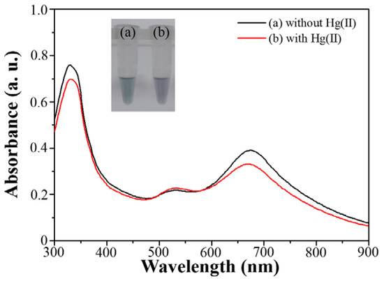 The environmental conservation of fresh water resources and the efforts to protect fresh water from hazardous contaminants have become a primary priority in many countries. Mercury (Hg), existing in nature and being constantly produced by industries, had posed serious risks to the environment and has already caused harm to humans from its toxicity [1,2,3,4]. Early detection and intervention of the suspected pollution are critical to prevent a potential environmental tragedy such as the Minamata Disaster in Japan in 1956. Early detection can succeed if a simple and sensitive measuring tool is developed to quantify Hg(II) in fresh water resources. At present, several methods have been used for Hg(II) determination, such as atomic absorption spectrometry (AAS), atomic fluorescence spectrometry (AFS), stripping voltammetry, and polarography [5,6,7]. These analytical methods offer advantages in terms of good stability, selectivity, sensitivity, and legal acceptability as the national standard detection methods for many countries. The drawbacks of these methods include bulky instrumentation, high cost per analysis, long analysis time, stringent requirements of sample storage, highly trained personnel, and relatively expensive instruments, which thereby limits their use for fast Hg(II) monitoring in the field. Hence, a portable, facile, rapid, and low cost colorimetric method for Hg(II) detection is needed.
