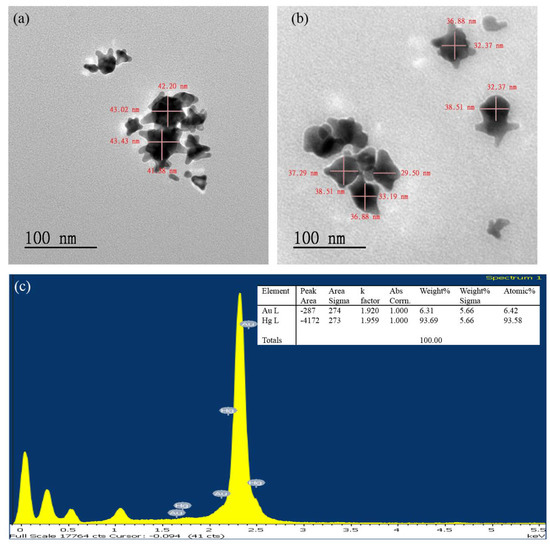 TEM images of the H-AuNS probe (a) without and (b) with Hg(II) (1.0 μM) in the absence of HCl/Au(III)/H2O2 solutions; (c) EDX spectrum of the H-AuNS probe with Hg(II) in the absence of HCl/Au(III)/H2O2 solution.