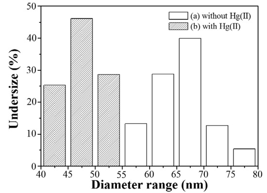 Investigation on the effects of Hg(II) on the size and shape change in H-AsNSs was carried out with UV-Vis, TEM, and dynamic light scattering to gain a deeper understanding of the H-AuNS dissolution process. First, the H-AuNS probe was mixed with Hg(II) alone, and the change in its optical property from UV-Vis was observed in Figure 3. Adding Hg(II) to the H-AuNSs solution decreased the SPR absorbance (red curve), which reflects the change of the particle morphologies and dielectric constants upon the reaction between AuNSs and Hg(II). Second, the morphology change from the reaction between AuNS and Hg(II) was observed by TEM, as shown in Figure 4. From the TEM image, noticeable branches were observed in AuNSs, and the number and the size of branches were reduced after reacting with Hg(II) for 10 min. The size was reduced upon the addition of Hg(II); the widths of the H-AuNSs without and with Hg(II) were 42.5 ± 0.7 and 38.4 ± 3.3 nm, respectively. Third, EDX again confirmed the coexistence of Au and Hg elements, as shown in Figure 4b. Finally, dynamic light scattering determined that the effective hydrodynamic diameter of the AuNPs without and with Hg(II) were 67.5 ± 8.8 and 48.3 ± 4.4 nm, respectively (Figure 5). All results indicated that Hg(II) effectively dissolved H-AuNSs because of the AuHg amalgam formation.