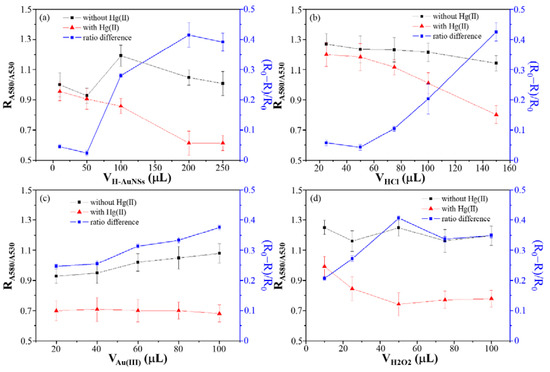 SPR band ratios (R: A580/A530) to evaluate the catalytic effects of the H-AuNS probe (■) on AuNP growth without (■) and with (▲) of Hg(II) (1.0 μM) in the presence of HCl/Au(III)/H2O2 solution, at different volumes of (a) H-AuNSs, (b) HCl, (c) Au(III), and (d) H2O2. Error bars represent standard deviations from three repeated experiments.