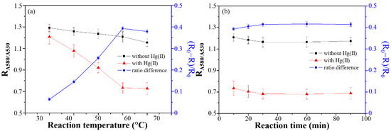 The effect of temperature on the change in SPR band ratio was investigated over the range 30–70 °C. In Figure 7a, the SPR band change ratio in the sensing system increased with an increase in the reaction temperature before reaching a plateau at 60 °C (Figure 7a). As the temperature increased, the frequency of collisions between Hg(II) and H-AuNSs increased, resulting in an increased degree of dissolution for H-AuNSs. At a fixed temperature at 60 °C, the change in SPR ratio only increased slightly as time elapsed, reaching a maximum at 30 min, which was attributed to the dissolving rate for the H-AuNSs reaching the maximum (Figure 7b). Fortunately, a majority of AuNPs was formed and stabilized within the first 10 min of reaction. Therefore, a temperature of 60 °C and a reaction time of 10 min were chosen for water analysis.