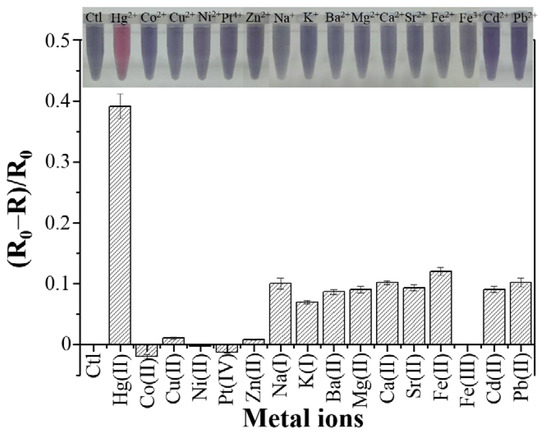 Selectivity of the H-AuNS probe in the presence of HCl/Au(III)/H2O2 solution toward Hg(II) ions. The Hg(II) concentration was 1.0 μM, and the concentration of each of the other metal ions was 10 μM. Inset: photographs of the H-AuNS probe with different metal ions in the presence of HCl/Au(III)/H2O2 solution. Error bars represent standard deviations from three repeated experiments.