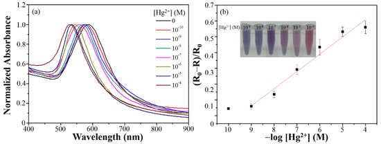 The sensitivity of the H-AuNS probe in the presence of the HCl/Au(III)/H2O2 solution was studied at its optimum conditions after being equilibrated at 60 °C for 10 min by lowering the Hg(II) concentration to a level where the color change of the AuNP solution was detectable with the naked eye. At the same time, the UV–Vis spectra of the AuNP solutions containing different Hg(II) concentrations were examined for the construction of a quantitative assay. A blue shift from the SPR perspective, or a red shift from the visual inspection, was distinctively observable with an increase in the Hg(II) concentration, as shown in Figure 9a. The color of the solutions changed from light purple to red as the Hg(II) concentration was increased from 1.0 nM to 100 μM (Inset image in Figure 9b). The visual detection limit for Hg(II) was 10.0 nM with the naked eye. A linear relationship was found between the ratio and the logarithmic concentration of Hg(II) over the range 1.0 nM–100 μM, and the linear correlation coefficient was 0.9607. Considering a signal-to-noise ratio of 3, the limit of detection (LOD) for Hg(II) by the H-AuNS probe was 0.7 nM. This result suggested that the H-AuNS probe, in the presence of the HCl/Au(III)/H2O2 solution, is well-suited for monitoring Hg(II) ions in environmental water samples, as the probe can detect Hg(II) lower than US EPA drinking water standard for the highest Hg(II) concentration permitted in drinking water at 10.0 nM.