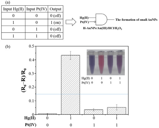 Construction of a NIMPLY logic gate with a H-AuNS probe was investigated to improve the specificity of Hg(II) detection. This unique logic gate used Hg(II) and Pt(IV) ions as input and the formation of small AuNPs as the output, as shown in Figure 10. A high output of signal coming from a high relative change in the SPR ratio or from a distinctive visual color change to red was assigned as the “ON” signal and output value of 1. This two-input NIMPLY logic gate produced a high output (output = 1) in the presence of a Hg(II) input alone (input for Hg(II) = 1, input for Pt(IV) = 0). But when only Pt(IV) was present (0, 1) and both Pt(IV) and Hg (II) inputs (1, 1) were present, the formation of small AuNPs was suppressed (output = 0) due to the preferential formation of Au/Pt alloy on the H-AuNS surface [36,37]. The nanoparticles after the logic gate experiment were collected and further analyzed by ICP-MS. The ICP-MS results show that the AuNP possessed 4055 ± 120 Hg atoms per AuNP and 3588 ± 100 Pt atoms per AuNP in the presence of Hg(II) and Pt(IV), respectively. But the number of Hg atoms were reduced dramatically when the H-AuNS probe was exposed to the mixture of Hg(II) and Pt(IV) with 388 ± 108 Hg atoms and 3248 ± 32 Pt atoms per AuNP. This study reveals that Pt(IV) forms an alloy with Au, which protects H-AuNSs and inhibits the formation of small AuNPs. When both Pt(IV) and Hg(II) are present (input = 1, 1) in the water sample, a stronger interaction between Pt(IV) and H-AuNSs (E0Pt(IV)/Pt: 1.48 V) compared to Hg(II) and H-AuNSs (E0Hg(II)/Hg: 0.85 V) takes place, significantly lowering the effect of Hg in dissolving branches of H-AuNSs and strongly hindering the formation of small-sized AuNPs(output = 0).