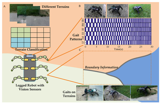 Hexapod robot and terrain classification. (A) stands for different terrains. (B) represents the gait of the robot in single terrains. (C) represents the gait in mixed terrains.