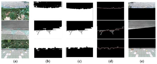 The segmentation result of the mixed-terrain images: (a) segmentation results of the SLIC algorithm; (b) maximum super-pixel extraction; (c) filtering out of smaller areas; (d) finding the boundary and fitting the line; and (e) finished segmentation.