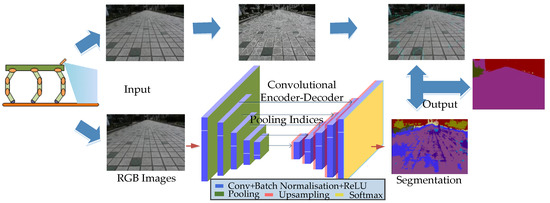 Convolutional neural networks (CNNs) [36] have become a research hotspot in the image processing field. They have a weight-sharing structure similar to biological neural networks, which reduces the complexity of a network model, and a number of weights, and alleviates the overfitting problem of the model. The image can be directly used as a network input to avoid the complicated feature extraction and data reconstruction of the traditional recognition algorithms; in addition, a CNN structure can better adapt to the image structure. SegNet is a deep learning network proposed by Cambridge to solve the semantic segmentation of autopilot or intelligent robot images based on the Caffe framework. We perform training and testing on the original SegNet architecture, collect terrain images of the robot’s walking environment, and input images that need to be segmented. Then, we perform the convolution operations to extract the high-dimensional image features and make the images smaller through sampling and pooling. After deconvolution and downsampling, the features of the image classification are reconstructed. Finally, the maximum value of different classifications is output by the Softmax layer, and the segmentation result with a semantic filling is obtained.