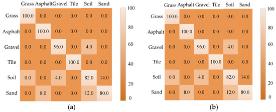 (a) Classification results of a single terrain; and (b) the recognition rate of the mixed terrain.