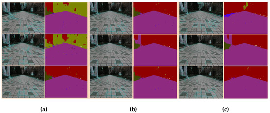 It can be seen in Figure 12 that, in the complex irregular mixed terrain environment, the SLIC-SVM terrain classification method cannot perform correct image segmentation, resulting in terrain tag recognition errors. For example, a mixed terrain with irregular boundaries of various terrain types including grassland, land, and sidewalks is mistakenly judged as a single terrain: grassland. SegNet image semantic segmentation, although roughly meeting the requirements of complex mixed terrain classification, as can be seen from the experiment in Figure 12c, the boundary information of the mixed terrain is very blurred, and will lead the robot to make the incorrect gait transition at the terrain boundary, which may cause the robot to be unstable. The SLIC-SegNet terrain classification method solves the classification problem that the SLIC-SVM cannot identify the mixed terrain with irregular boundaries. On the other hand, it optimizes the SegNet terrain classification effect and obtains the terrain classification result with clear boundary and high accuracy. It provides a strong basis for the gait transition and path planning of the robot to meet the stability requirements during the process.