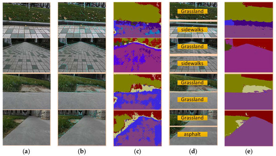 The terrain classification results of the SLIC-SVM and SLIC-SegNet: (a) images to be processed; (b) SLIC results; (c) SegNet results; (d) SLIC-SVM results; and (e) SLIC-SegNet results.