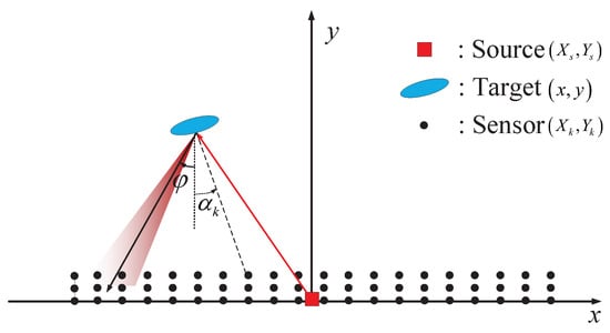 with , and being locations of the target, the active source, and the k-th sensor, respectively; is the angle from the k-th sensor to the target: