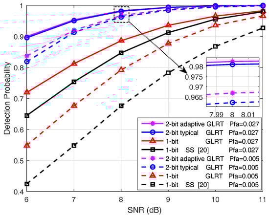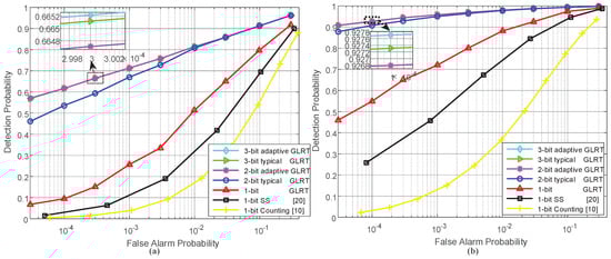 Note that the choice of the quantization parameter for the proposed quantizer should affect the final detection and localization performance. However, the optimization of parameter is a impermissible task due to the unavailability of target parameters. Nevertheless, we set to be the same as the quantization threshold in the one-bit quantization case described in Section 3, i.e., set to gain insight into the performance of the detector employing the proposed adaptive quantizer as well as to make a relatively fair comparison with the one-bit quantization-based GLRT.