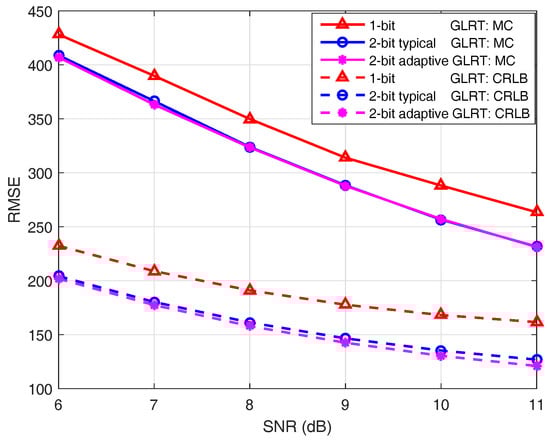 where is the MLE of the target location. The lower bounds of the RMSE for different GLRT detectors are then specified by their CRLB matrixes. Specifically, gives the lower bound of the RMSE for one-bit quantization based GLRT, and the lower bounds of the RMSE for the GLRT detectors based on 2-bit quantization can be obtained similarly.