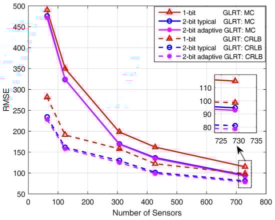 Figure 5 demonstrates the RMSE under various sensor deployments. More specifically, the minimum distances between sensors are , 80, 48, 40, and 30, respectively, thus giving rise to the sensor fields with , 124, 306, 427, and 729 sensors. It is observed that when the number of sensors increases, the RMSE decreases considerably; meanwhile, the gap between the RMSE of MC experiments and its CRLB also decreases.