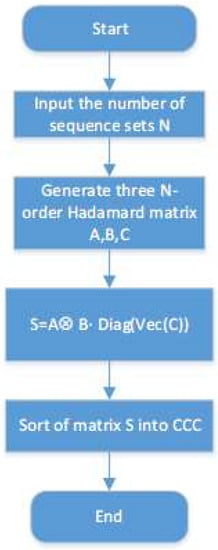 Figure 1 shows the flow chart of {} CCC’s generation. Firstly, the number of sequence sets N should be determined (N = ). Secondly, three N-order Hadamard matrices should be generated; they can be indexed by A, B, C. Then, a matrix S can be generated by a recapitulate formula. Three different matrix operations, Kronecker product, vectorization, and the “Diag” operator, are used in the formula. At last, we should transform the matrix S into sequence sets. Each row of S is a sequence, and each row of N is a subset. Table 1 shows a set of {4, 4, 16} complete complementary sequences. In Table 1, + and −, respectively representing +1 and −1, the four subsets are indexed by letters A, B, C, D, and the sequences in a subset are indexed by numbers 0, 1, 2, 3.