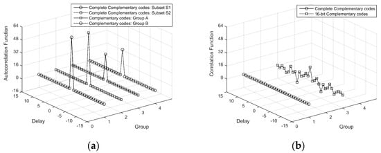 The ambiguity function of the complete complementary code is the sum of ambiguity functions of each sequence in a subset [], which can be represented by Equations (8) and (9),