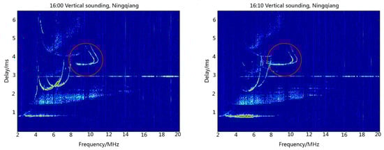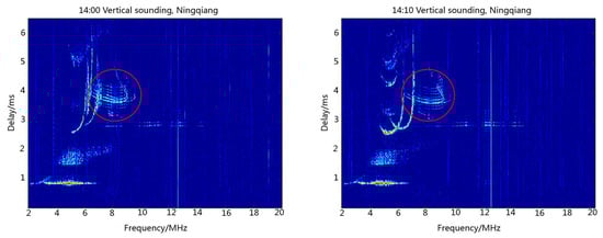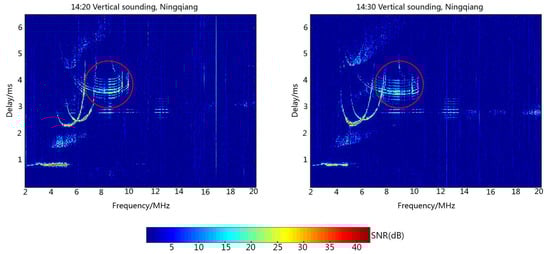 Figure 5 illustrates the ionograms recorded at Ningqiang on 23 June 2018 when the ionosondes installed at Ningqiang and Wuhan synchronously transmitted the same 16-bit complementary code at 14:00 Beijing time (BJT). Parameters of the ionosphere at Ningqiang can be obtained from ionograms. For example, based on the delay time, we can derive the virtual height of the E and F2 layers (h’E = 140 km, h’F2 = 330 km). The red circles in Figure 5 show the reflection signal echoes of the F-layer at the middle of the propagation path from Wuhan to Ningqiang. It is seen from Figure 5 that the echoes of the vertical sounding at Ningqiang and oblique sounding from Wuhan overlapped on the ionograms. Obviously, these kinds of ionograms are difficult to be scaled automatically using the current software.
