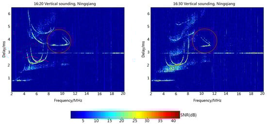 In the second experiment, the ionosondes installed at Ningqiang and Wuhan synchronously transmitted the different codes, non-orthogonal complementary codes, at 16:00 BJT. Figure 6 shows the ionograms recorded at Ningqiang on 14 July 2018. Similar to Figure 5, Figure 6 also displays the vertical sounding echoes from Ningqiang and oblique sounding echoes (in red circles) from Wuhan. The signals received at Ningqiang are processed by the local-field emission code. Due to the non-orthogonal complementary codes, the receiver at Ningqiang also recorded the oblique signal transmitted from Wuhan. Similar to the first experiment, the ionograms in this case are also difficult to scale automatically using the current tool. This therefore inspires us to further change the transmitted codes in the experiment to avoid the interference resulting from the oblique sounding signal from Wuhan.