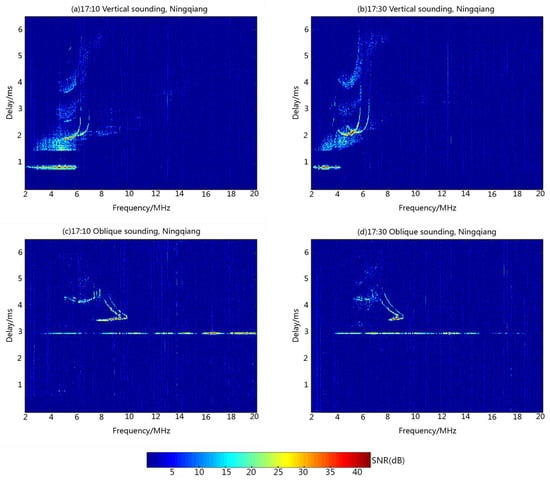 Multi-station sounding experiment using complete complementary code: Vertical sounding ionogram at (a) 17:10, and (b) 17:30; Oblique sounding ionogram at (c) 17:10, and (d) 17:30.