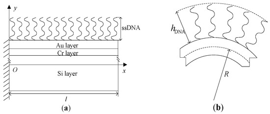 The DNA-microcantilever sensor is a multilayer structure, and is shown in Figure 1, which consists of two parts: DNA film and non-biological layers. The non-biological layers include three layers [24]. Each of these non-biological layers has its own function. The silicon is used as the substrate structural material of the cantilever. A thin gold film is deposited and patterned on one side of the cantilevers to allow immobilization of biomolecules through gold-thiol (Au-S) bonds. For good adhesion between gold and silicon, a thin chrome film is deposited on the silicon cantilever before the deposition of gold. For simplicity, the non-biological layers are perfectly elastic and homogeneous. Assuming that the interface bonding between different layers is perfect, the strain on the surface of two adjacent layers must be equal during the bending of the cantilever. In addition, the ordered conformation of thiolated ssDNA molecules on gold surfaces is assumed. The centroidal axis of the cantilever is taken as the coordinate axis x; its vertical direction along the cantilever thickness is consistent with that of the coordinate axis y. Here, l, b and h are the length, width and thickness, respectively; hAu, hCr, and hSi represent the respective thicknesses, and h = hAu + hCr + hSi; EAu, ECr, and ESi are the respective elastic moduli.