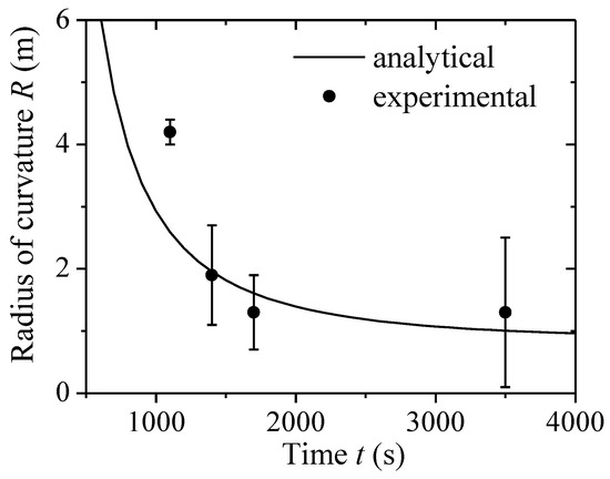 Solving Equation (12) and substituting it into Equation (7) yields the radius of curvature. Using the Euler–Bernoulli beam theory for a small deflection, the deflection of the cantilever is predicted by [27]