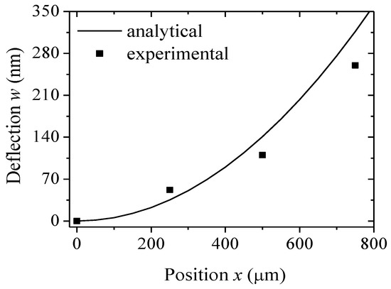 To further validate this model, the steady deflection of the DNA-microcantilever sensor was predicted. For the steady deflection, no further deflection occurred, suggesting that the adsorption of thiolated DNA chains had reached an equilibrium coverage. The related parameters are the same as those in Figure 2. The predicted steady deflection of the cantilever at each position when η = η0 is illustrated in Figure 3. For comparison purposes, the experimental data by Jeon et al. [24] are also shown in Figure 3. Due to the lack of error bars of steady deflections in Jeon’s experiment, however, there are no error bars in Figure 3. It can be seen that the analytical prediction is consistent with the experimental results. The bending profile of the cantilever with a thiolated DNA chain closely follows a circular trajectory. Because the contribution of interchain interactions of the DNA chain to motion is relatively small, the Euler–Bernoulli beam theory can describe the nanomechanics of microcantilevers induced by DNA adsorption.