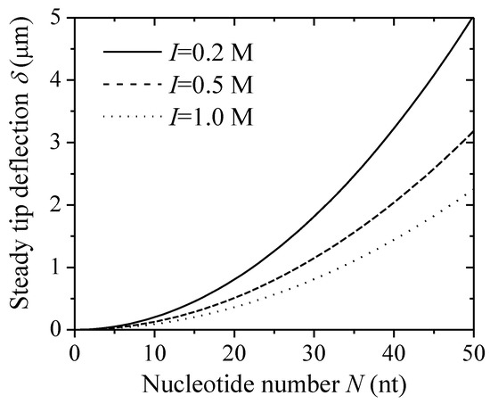 In the microcantilever-based system, the steady deflection of the free end of the cantilever (i.e., steady tip deflection) was detected to analyze the corresponding surface loadings (i.e., surface stress) [13,16]. Experiments have shown that the steady tip deflection of a DNA-microcantilever sensor can be induced by many factors. Here, Figure 4 shows the changes in steady tip deflections with a nucleotide number at given salt concentrations (η = 0.05 chain nm−2). The steady tip deflections are a strong function of the nucleotide number, and scale with N2. This result is in quantitative agreement with that from the Monte Carlo (MC) simulations [21]. In addition, with the increase of salt concentration, the steady tip deflection decreases. This reduces the relative contribution of the excluded-volume energy of DNA film to nanomechanical motion.