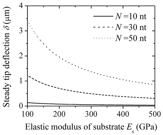 In addition to the effect of the thickness of substrate on tip deflections, the elastic modulus of substrate also affects deflections. Figure 6 shows the steady tip deflection of a microcantilever-based DNA sensor as a function of the elastic modulus of substrate Es under different nucleotide numbers (η = 0.05 chain nm−2, I = 1 M). From the figure, the steady tip deflection decreases with the increase of the elastic modulus of substrate at a given nucleotide number. As the elastic modulus of substrate increases, the total bending stiffness for multilayer beams enhances, which decreases the steady tip deflection. It can be inferred that a cantilever with a lower elastic modulus will produce a greater deflection signal, such as polydimethylsiloxane (PDMS) [31,32]. Additionally, the steady tip deflection increases as the nucleotide number increases.