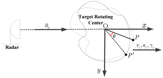 In this section, we do not consider the motion compensation problem, which means that the standard range alignment and phase adjustment are implemented beforehand. In Figure 1, the ISAR geometric configuration of a target with the complex motion is depicted, where is a Cartesian coordinate and the origin O is the position of target rotating center. In Figure 1, the denotes the initial distance of origin O to radar platform, and ,, and respectively represent the radial velocity, the acceleration, and the acceleration rate. With those notations, the instantaneous rotation angle is