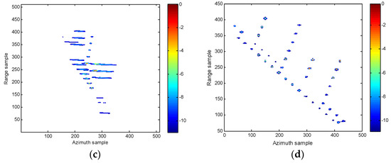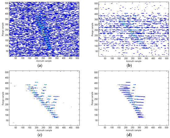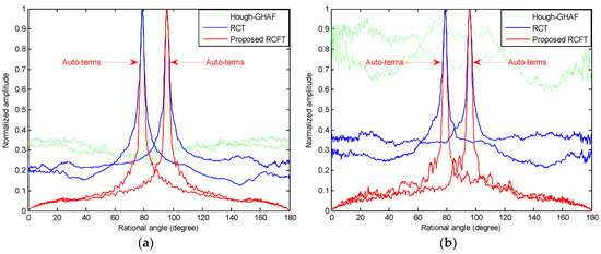 where is the FT coherent integration gain. Meanwhile, when or , the energy of the auto-terms integration due to incoherent integration or the fact that only part of the auto-terms energy is accumulated. Figure 2c,d depicts the coherent integration results of the Figure 2a obtained by the proposed RCFT method in the Radon domain, where only the auto-terms are accumulated into peaks, while the cross-terms and spurious peaks are almost completely suppressed. Although Figure 2c shows that there also exist the cross-terms on the RCFT plane, they are much smaller compared to the auto-terms. Unlike the traditional quadratic time-frequency distributions that usually exploit the smoothing, optimal kernel design or nonlinear filtering techniques to moderately tradeoff between the cross-terms and resolution, the proposed RCFT, on its own, can greatly “suppress” the cross-terms without any resolution loss. By “suppress”, we mean a relative suppression is achieved since the RCFT greatly strengthens the energy of the auto-terms instead of suppressing the cross-terms directly.