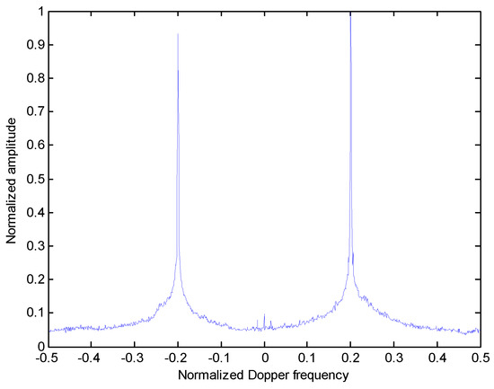 It is a common knowledge that the Doppler frequency of each scatterer is proportional to its cross-range position in the target. Hence, the cross-range ISAR image of the target can be obtained by its projection onto the Doppler frequency axis. In Figure 5, the projection results of the RCFT shown in the Figure 2 along the Doppler frequency dimension is presented. It is seen that two distinct peaks appear along the Doppler frequency axis, which corresponds to two scatterer cross-range positions.