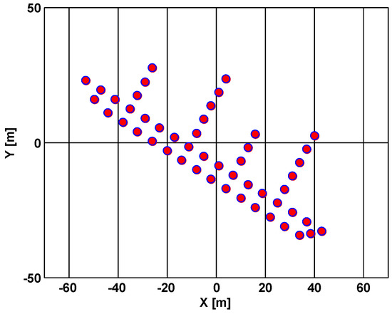 To confirm the validity of the proposed algorithm, simulation experiments are conducted now under two conditions of input SNR = 5 dB and SNR = −3 dB with the simulation parameters of the radar and the moving target listed in Table 1. The target scatterer model used in the simulation was a ship with 49 scatterers, shown in Figure 7.