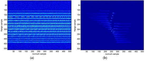 In (6), because of the nonlinear coupling between azimuth slow-time variable and the lag time variable , the energy of the auto-terms concentrates along the line of in the slow time-Doppler frequency plane. Utilizing this line, the third- and second-order coefficients are extracted by the slope and the y-intercept [17]. However, in the case of multi-component QFM signal, the identifiability of the CPF is of problem because of cross-terms and spurious peaks [17,18]. To visually demonstrate this issue, the CPF of a two-component QFM signal with length with parameters , , and , , and is shown in Figure 2. From Figure 2a,b, a sharp spurious peak is of presence, and the energy of auto-terms is focused along the slope lines (i.e., ), whereas the energy of cross-terms is diffused in the domain since their positions vary with time . Generally speaking, for a K-component QFM signal, there are cross-terms and spurious peaks [17], which pose a serious interference to the estimation and detection of the auto-terms, unless they are properly reduced.