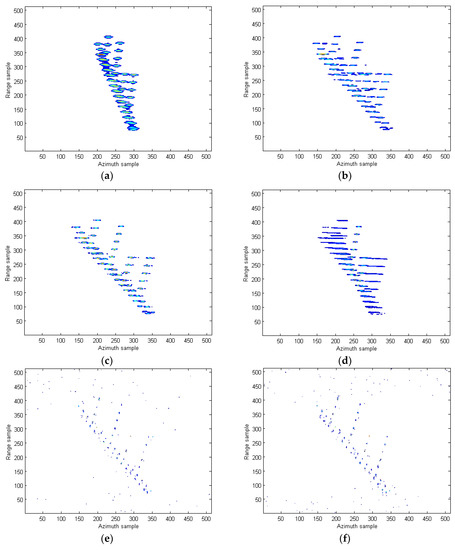 For the RCD method, its implementation steps mainly include performing the quasi-time-frequency distribution (Lv’s distribution) to each range cell. Take a range cell processing procedure for example, the complex multiplication in constructing the symmetric instantaneous autocorrelation function matrix with computational complexity of , the FFT operation along the lag-time variable axis with computational cost of , a keystone transform adopted to remove the coupling terms with complexity , where is the length of the interpolation operation kernel, the FFT operation along the scaling slow time variable with computational cost of , and neglecting other relatively small computational complexity operation steps. Therefore, the total computational complexity of the RCD algorithm [15] is