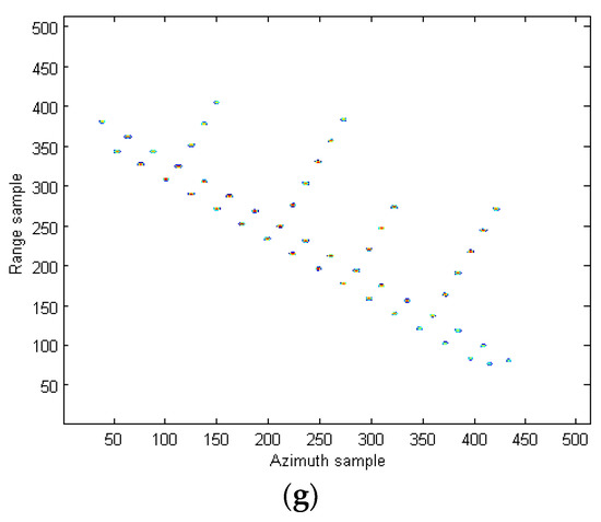 The 2-dimensional (2-D) ISAR image obtained by the RD algorithm under SNR = 5 dB is provided in Figure 9b. Since the Doppler frequency is time-varying, it is observed that the image is seriously blurred in the cross range. The images produced by STFT, WVD, and SPWVD are demonstrated in Figure 10a–c, respectively. Because of the cross-terms interference in WVD, the shape of ship is not visible. Suffering from low resolutions, the images from STFT and SPWVD are not focused well and each scatter spreads out in azimuth direction. In Figure 10d, the ISAR imaging result obtained by the RCD method in [15] is presented. As discussed earlier, since this method is only valid for LFM signal, the image obtained is seriously blurred in the cross range. To clearly demonstrate the advantages of the proposed approach over the existing methods, we also compare the proposed method with the parameter estimation-based algorithms. Figure 10e,f provide the 2-D SAR images obtained by the IHAF-ICPF method [7], CIGCPF-CICPF method [9] at SNR = 5 dB. It is observed that ship shape is generated by those two approaches, but they are not free of residual interference. On another note, parameter estimation-based algorithms are computationally extensive and suffer from model mismatch issue, which limit their usages. Figure 10g shows the high-quality ISAR image produced by the proposed quasi-time-frequency RCFT, where image is well focused in both range and azimuth directions, which agrees with our theoretical analysis. Figure 11 presents the ISAR images obtained by the aforementioned methods under SNR = −3 dB. Compared with other methods, under the low SNR condition, our proposed ISAR imaging algorithm still produces high quality image. This means most scatterers are relocated correctly with less scatterers loss and less artifact appearances as presented in Figure 11g. This superior performance obtained is all because the 2-D coherent integrations and bilinear features utilized in the proposed methods to suppress the cross-terms and spurious peaks, and at the same time resolution is not sacrificed.
