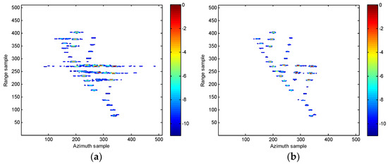 where . Entropies obtained by these methods are listed in Table 2, where the smallest values are obtained by the proposed imaging algorithm. This is in the agreement with the conclusions obtained in Figure 10 and Figure 11 since the proposed method produces the clearest ship model free of artifacts, and also demonstrate the effectiveness of the proposed ISAR imaging algorithm under low SNR condition.