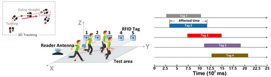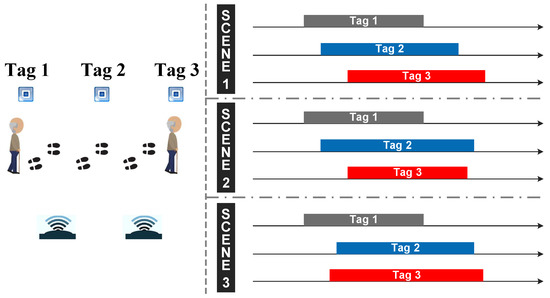 However, there are some special circumstances in the actual experiment. As is shown in Figure 8, when the person passes through the area where the tag sequence is Tag 1, Tag 2, Tag 3, the time series of three tags may overlap or coverage. In order to avoid these problems, we need to verify the time series of affected tags according to the tag affected time and the map profile, which include the location information of tags and reader antennas. This method has three advantages: (a) high-accuracy; (b) high robustness; (c) strong universality.