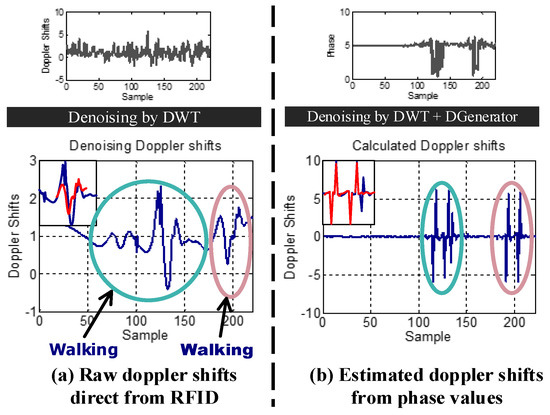 Compared with using the Doppler shifts received by the reader, the method using the Doppler shifts calculated by the phase profile can remove the influence of static multipath, and it can also get cleaner Doppler shifts values. As shown in Figure 2, we can easily know that the matching degree of the Doppler shifts calculated by the phase profile is higher. Once we extract the clean phase values, we utilize the phase offset () and time duration () to get the Doppler values () with Equation (2).