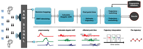 In this section, our goal is to map the object movement trajectory. This is performed through three steps: segmentation, trajectory estimate and trajectory smoothing. At first, segmentation helps us excavate the period when tags are affected by the target. In addition, the trajectory estimate part helps us map the preliminary object movement trajectory referring to the tag affected time. Finally, once the beginning and the ending of the tag affected time are determined, we compare the extracted signal pattern with path profiles to find the best match using Dynamic Time Warping (DTW) [22] and then connect our trajectory to the matched pattern, so that we can get the final fine-grained trajectory. Then, we describe different submodules in detail.