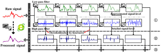 Noise reduction using DWT (① decomposition; ② threshold denoising; ③ reconstruction).