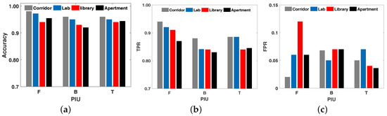 We measured four different experimental environments, including a short corridor, a reading room, a laboratory and a lobby in the same deployment. As is shown in Figure 12a, the accuracy of these four environments was 89.5%, 92.5%, 91.75% and 91.3%. The accuracy was highest in the laboratory, while the accuracy in the corridor was lowest. This situation is due to two reasons: Firstly, in the corridor, the number of barriers was more than other environments and the effective detection area was less than the others. Secondly, when people walked through the detection area, their bodies blocked the information exchange between the tags and antenna, so the reader could not receive the tag’s signals.