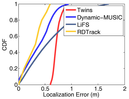 As shown in Figure 14a, we can figure out that 80% of anchor tags are measured within a 30-cm distance drift. This is an acceptable error when applying the anchor tag in real applications. Besides, the bars of accuracy in Figure 14a illustrate that most of the distance drift is concentrated in the interval of 30 cm–50 cm. This means that the extreme error occurs rarely. What is more, we analyze the tracking accuracy of RFTrack and compare it with RollCaller [11], Twins [12], Dynamic-MUSIC [29] and LIFS [10]. The comparative experiment was carried out in a general laboratory. There were desks, stools, computers and other daily necessities in the room. The indoor area was 8 m × 6.5 m. Under the same environment and deployment, we compared Twins, Dynamic-MUSIC, LiFS and our method. The results are shown in Figure 13. The average position error of our method is 0.33 m, while the error distribution of the other three methods is 0.71 m, 0.4 m and 0.52 m.